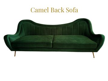 Olive green velvet mid-century silhouette - clean-lined arms and dramatic blind tufting.